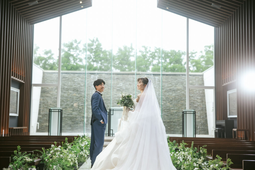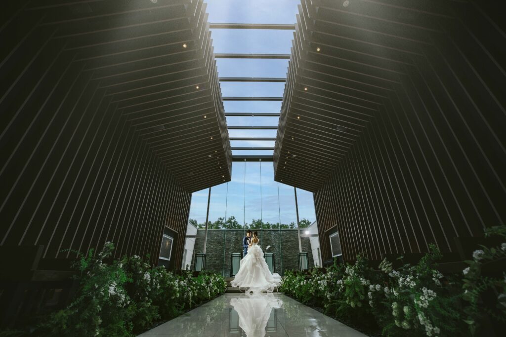 チャペル内は白を基調としたモダンで洗練された空間。天井が高く開放感があり、花嫁のウェディングドレスがより映えるシンプル&エレガントな雰囲気。光の反射が美しく、写真全体が柔らかく優雅な印象に仕上がります✨夏は冷房がしっかり効いていて快適に過ごしながら撮影できます。大きな窓から自然光が差し込み、昼間はナチュラルな雰囲気の中での撮影が可能。特に午前中〜昼過ぎの時間帯は、やわらかい光が降り注ぎ、神秘的な写真が撮れます。実際の挙式のように、ファーストミート風ショット、指輪交換や誓いのキス、ベールアップのシーンを再現した撮影も可能。