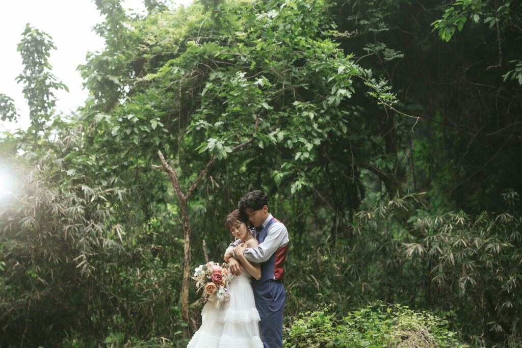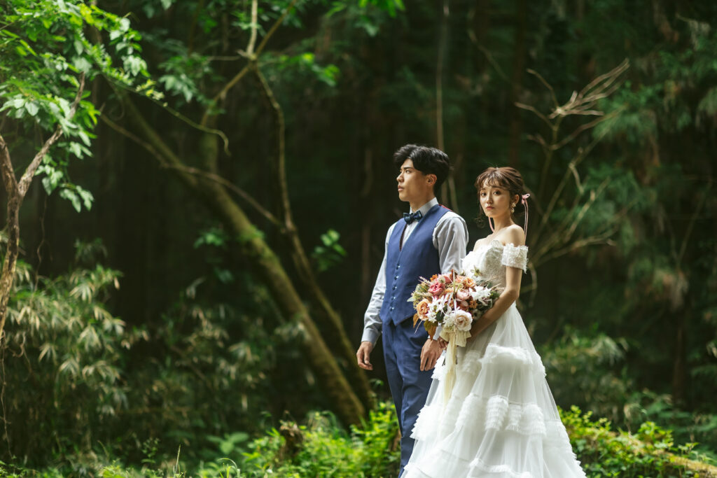 木漏れ日と緑に包まれる森の中で叶える、ナチュラルで幻想的なフォトウエディング🌿✨自然光がやさしく差し込み、ドレスが緑に映えるその瞬間は、まるで映画のワンシーン。静けさと自然の美しさに包まれた、ふたりだけの特別な一枚を残してみませんか?